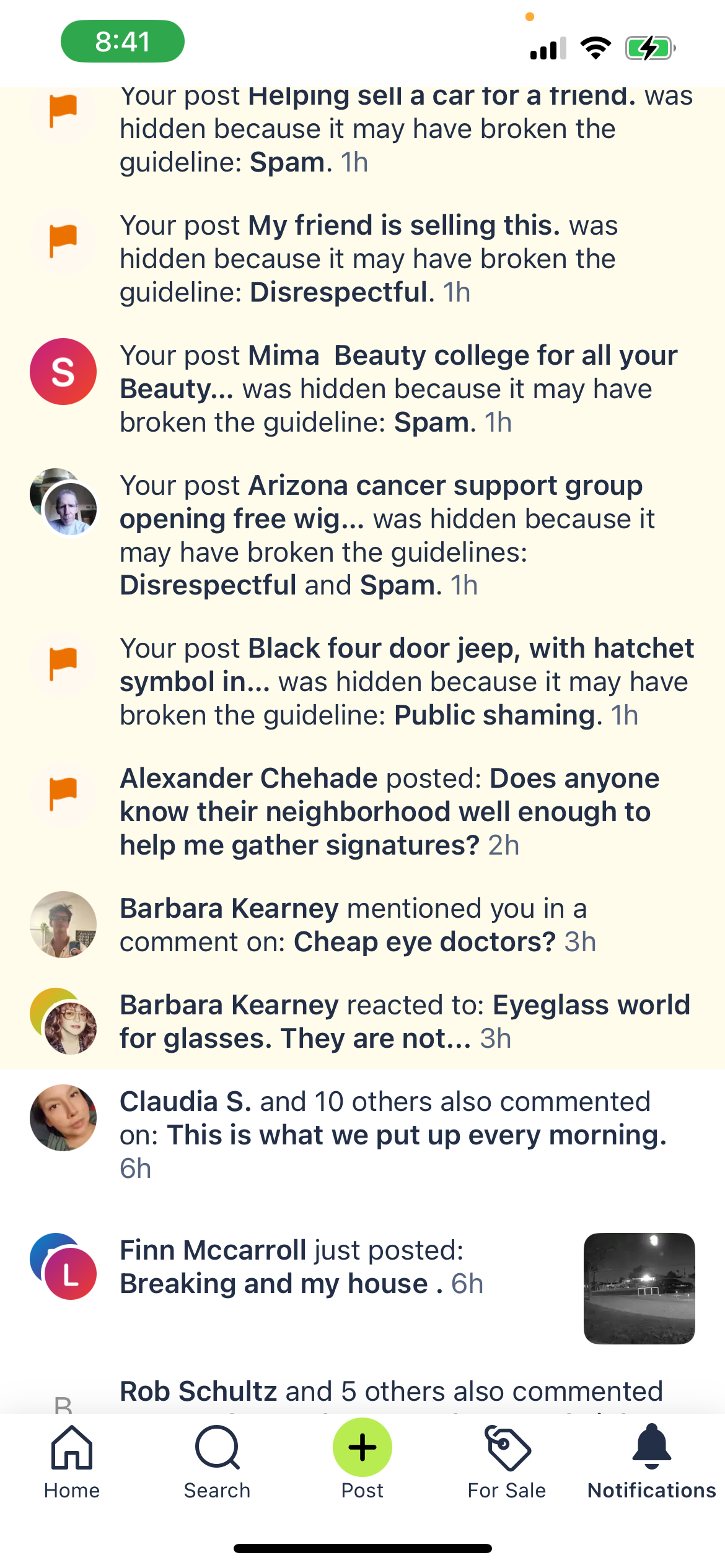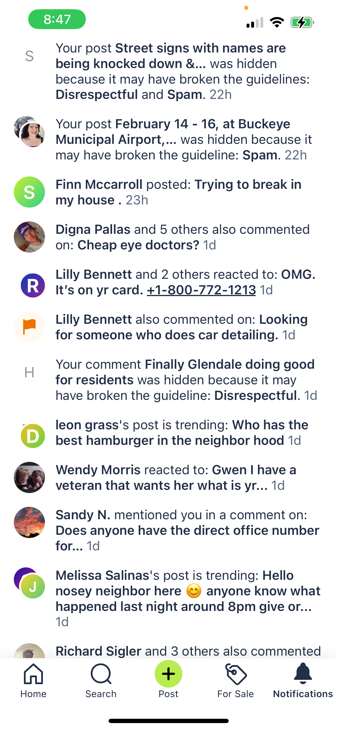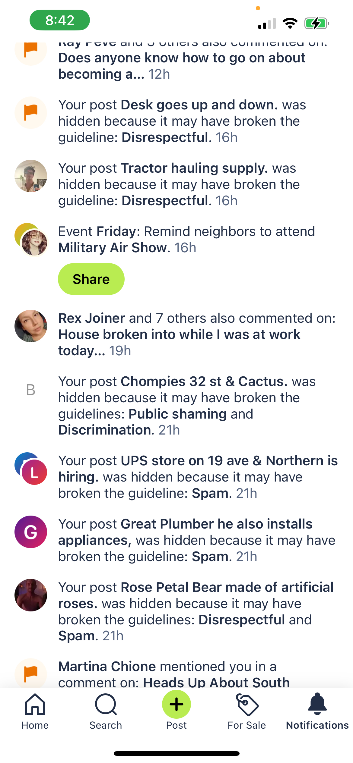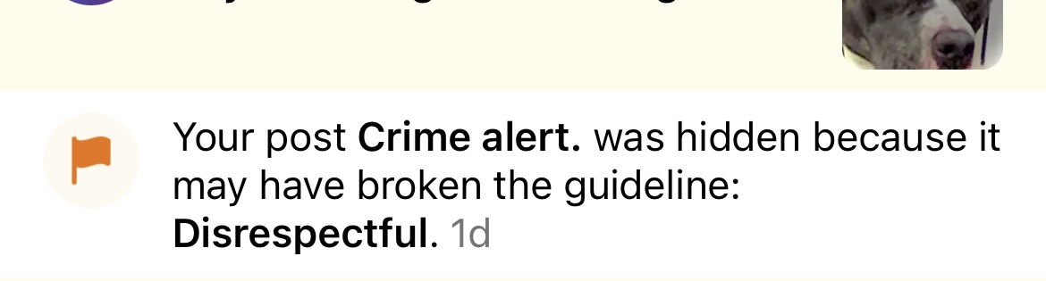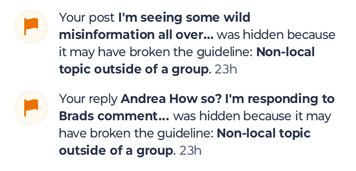 The moderators in any local area of Nextdoor just take down whatever they want. It doesn't matter what the guidelines are. The people working as moderators for next door are idiots. Their own personal preferences and ideologies enter into their editing of the website. It's a bunch of Karens that moderate these things. Absolutely ridiculous and unless this company gets bought I don't see how they survive. Who wants to advertise on Nextdoor? You'd have to be a complete moron. I had posted a couple political things and they hid them. So I wouldn't post any more but they just suspended my account over the posts that they already hid. If the posts are already hidden what am I supposed to do- delete them anyway? They've already been hidden so no one can see them. If no one can see them what's the point of suspending my account for 3 days? Unbelievable stupidity runs rampant through the moderators of Nextdoor. It's Karen Central.