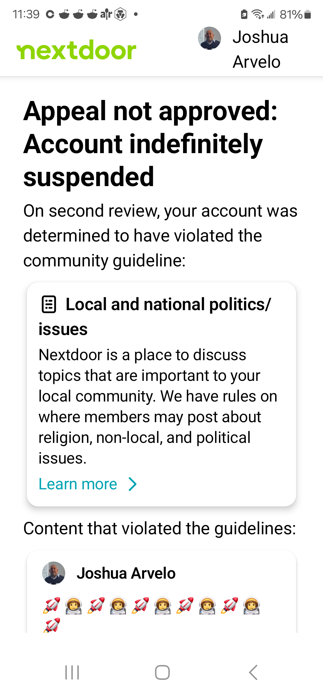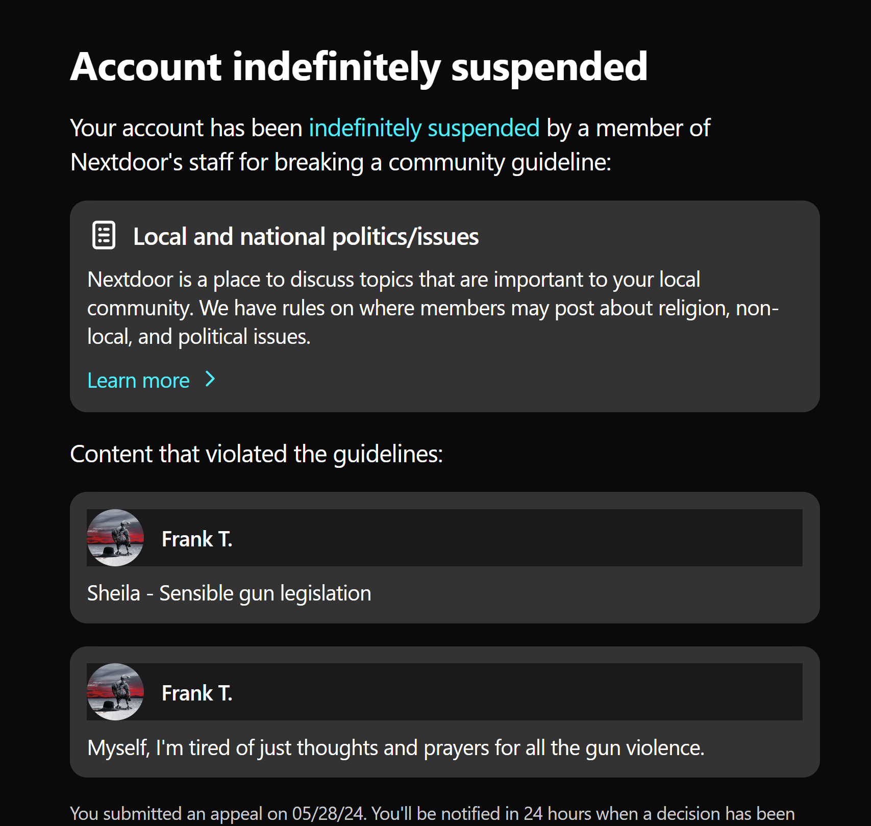 My account has been suspended for 2 weeks on the basis that I violated community guidelines for discussing politics. On numerous occasions I have asked Nextdoor local reviewers to remove a post regarding local immigration on the basis of the racist comments and the discussions of actions that makes the community at large less safe. I have interacted on the post. I was not rude and engaged in civil discussions. My engagement was primarily to decrease the bias in the local community. I escalated to nextdoor.com when action locally was not taken. On the escalation form I posted the exact thread that I was referencing as racist and a risk to the community. That support case number is Case # *******. Over the course of days several of my comments were removed for breaking some violation or another. All the while other comments that were rude, racist, dangerous, and violated community guidelines were allowed to stay on the post. The post was not removed. Mind you I know my viewpoints are not "in line" with most community members in the state of Texas. That is not a bad thing or anything that should allow the local reviewers to discriminate against me for. My voice is valid too! The first attempt to silence my voice was a personal attack on my identity. I was reported for not using my real name. My account was suspended. That was a completely bogus claim as I am using my real full legal name. I had to provide my drivers license to Nextdoor to prove my identity. That is an invasion of my privacy. Then a post I made for a call to action locally to help our neighbors was deleted, there was not a reason provided for its removal. A platform that allows neighbors to police their neighbors needs to have more checks and balances. After that first suspension it has been a non-stop attack on everything I have to say. Multiple comments of mine have been hidden or removed. And yet racist comments because they align with the local reviewers have been allowed to stay online.