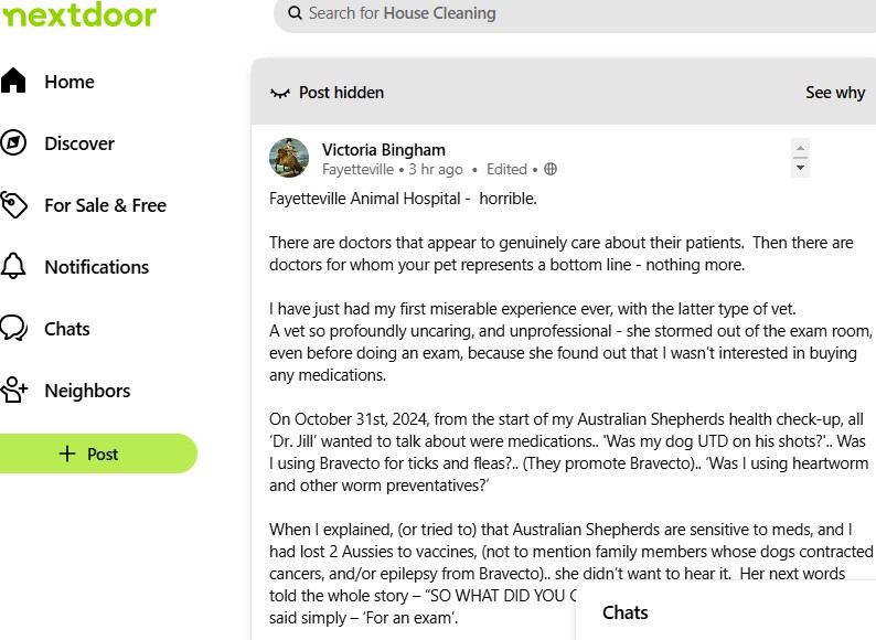 After I posted a copy of the 'removal', I was summarily suspended from NEXT DOOR - your local commie outfit that permits only cute puppy pictures, for sale items, and cat adoptions. But nothing of 'gravitas'. So here it is! My negative review of both Fayetteville Animal Hospital, AND Next door AND YELP! The pay for good reviews fake review platform that if you give them the $$$ will hide negative reviews under a cloud called 'Not recommended'. (Which when I visited that page, I discovered OTHER disillusioned former patrons of Fayetteville Animal Hosptial, one gal who actually referred to the doctor 'Kevorkian'..