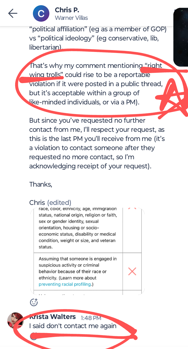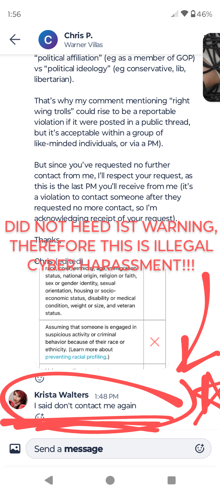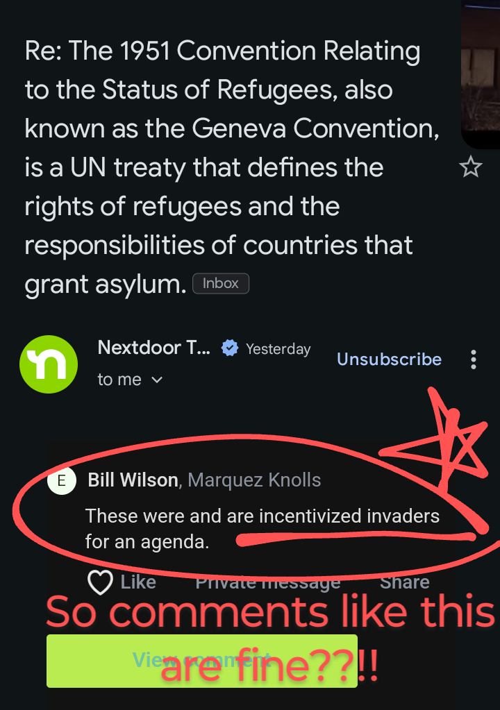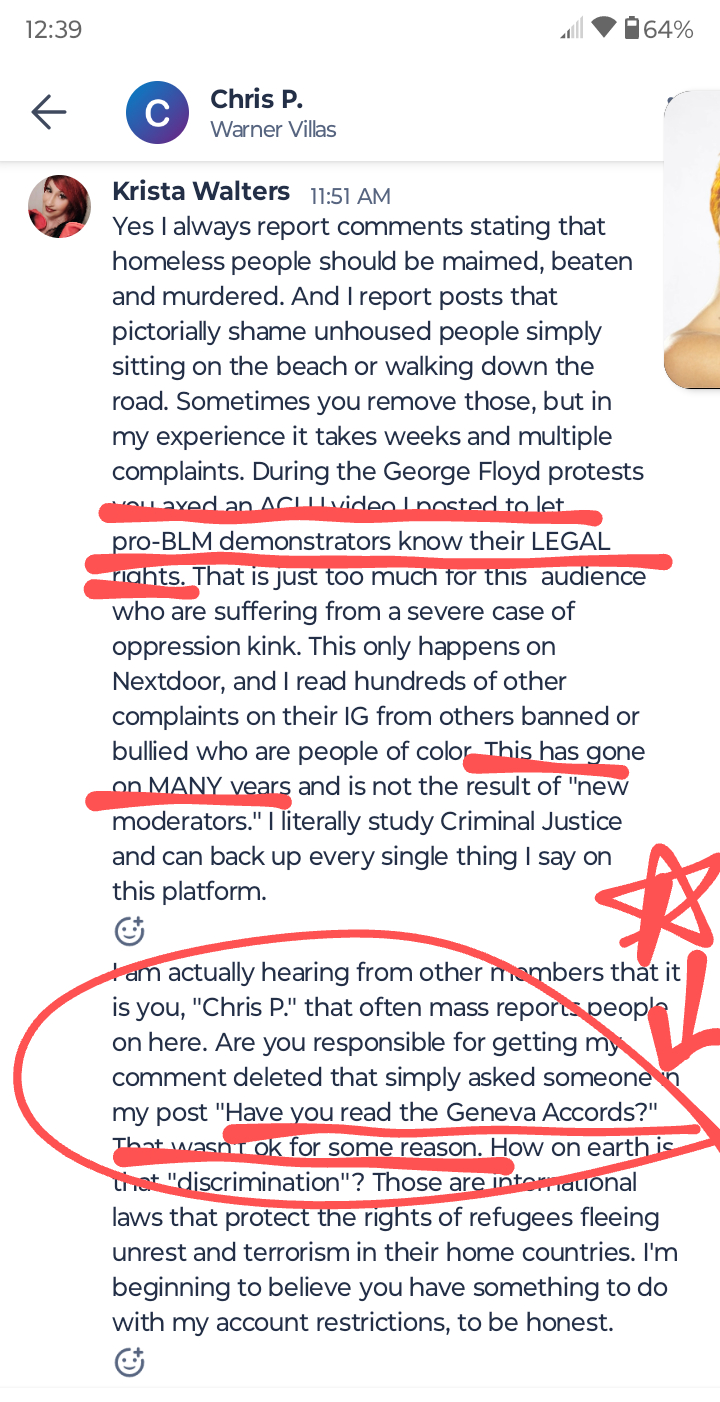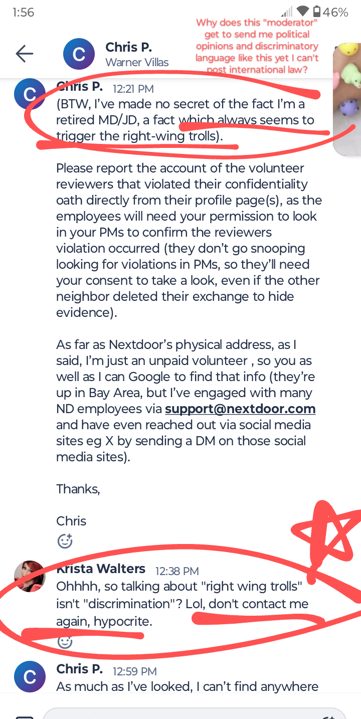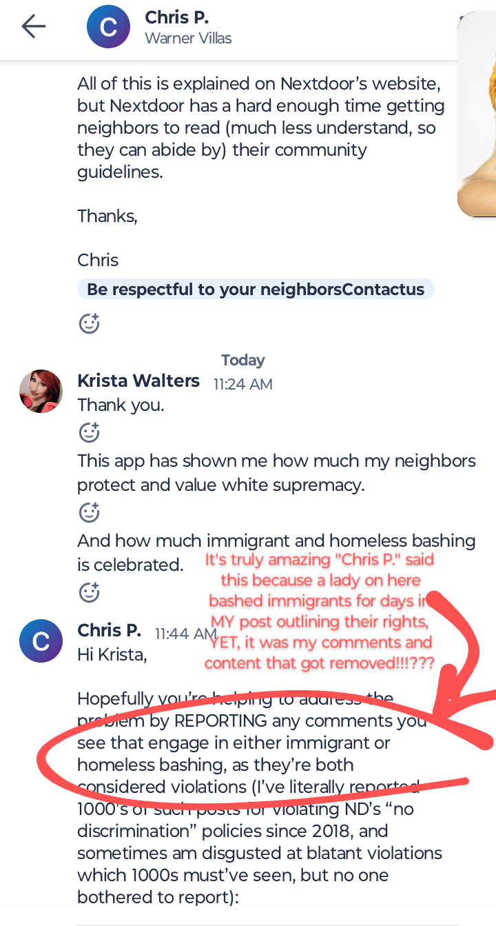 Why is it "non-local politics" to discuss immigration when every Pacific Palisades family has an immigrant nanny, house keeper and gardener who are all currently in danger of disappearing through ICE raids? Why can't I post International Law showing that refugees are legal and cannot be returned to a perilous country? And why was my previous appeal approved, and this post was given the green light then, it was banned again? What changed? Literally every time I log into Nextdoor I'm getting reported for different reasons: "fake name," "discrimination," "topic outside neighborhood," etcetera. Yet when I proved my identity you literally wiped my account clean of 5 years of posts and comments. This makes no sense whatsoever to continually punish me for bizarre reasons that are inapplicable. And why is my moderator allowed to commit cyber stalking and speak to me about "politics" in unwanted private messages? "Harassment" by state law is defined as repeated unwanted contact intended to annoy or harass and it does not include constitutionally protected activity or conduct that serves a legitimate purpose, i.e., free speech. Additionally, they live in Woodland Hills, absolutely nowhere near Pacific Palisades, by the way: "Chris P." in the valley gets to moderate what should and shouldn't get seen or heard for a place they don't even live anywhere near? Someone please explain?