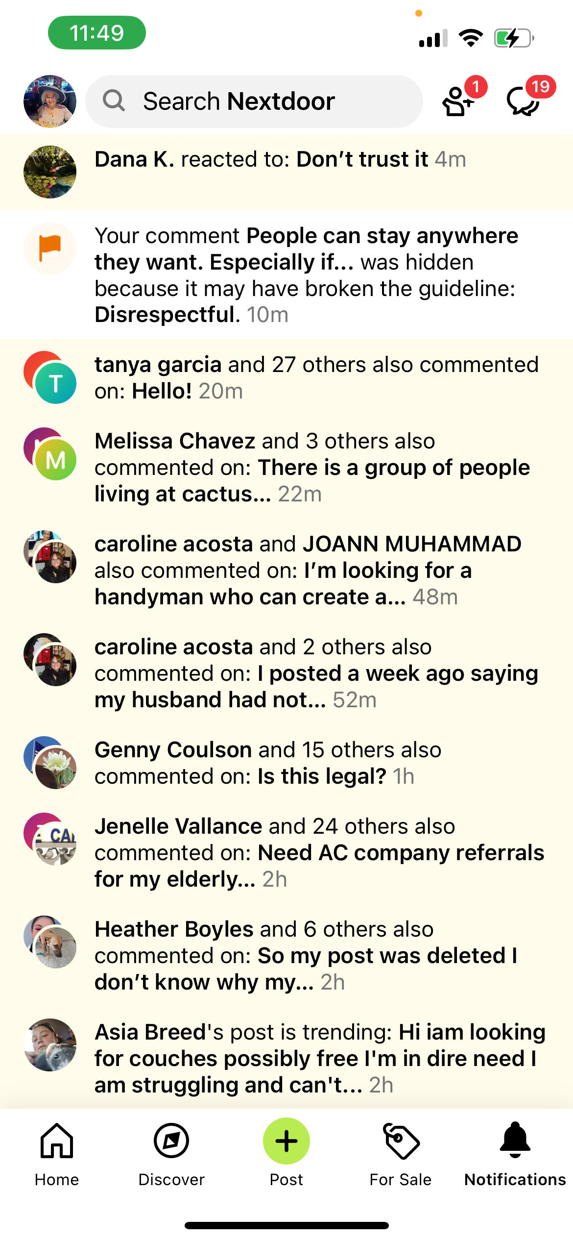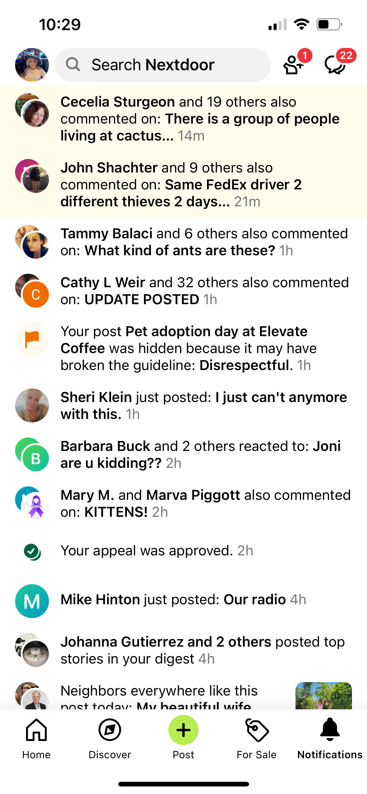 Everytime I post a comment about community events,recommendations,respond to peoples questions, my comments get reported day & night daily for over 3 years,it is getting worse now. I cannot respond to anything,I appeal everyday & night. I contact Nextdoor everyday & nothing happens at all. Sick of it!